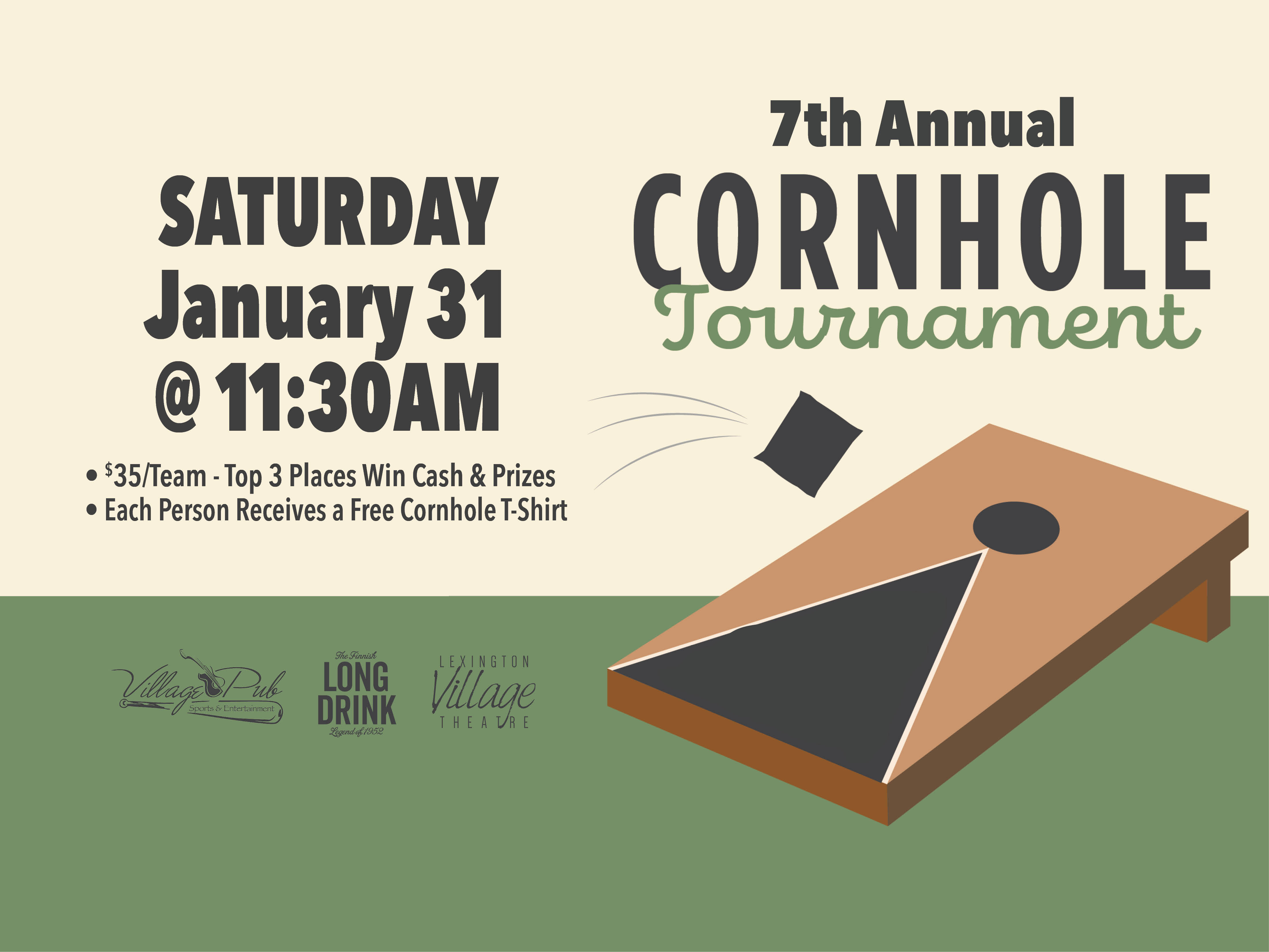 Join us for the 7th annual Lexington Village Theatre & Pub's Cornhole Tournament! Doors open at 10:00 am for registration, and bags fly at 11:30 am.