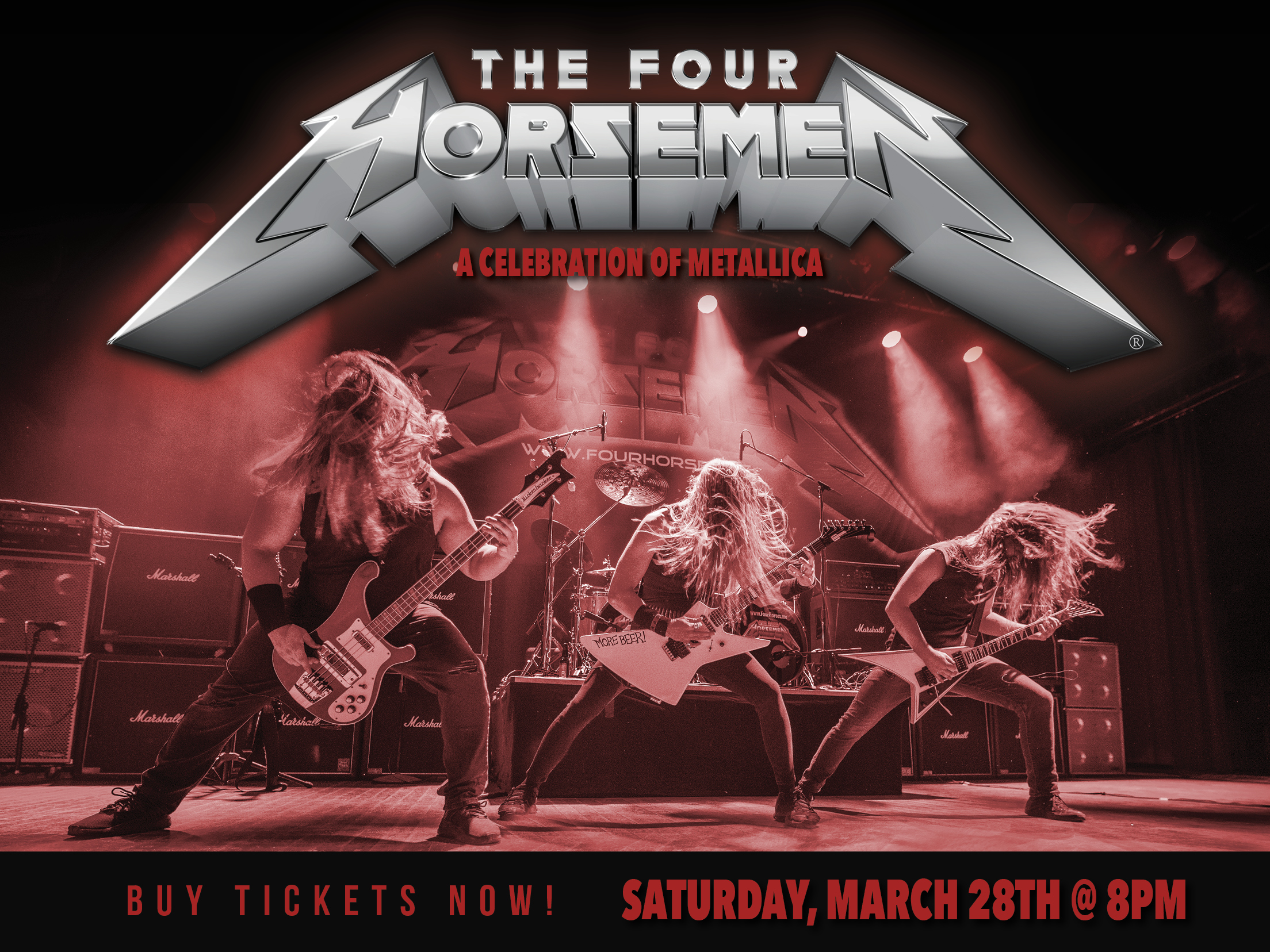 Dedication to excellence is what separates U.S. metal heroes THE FOUR HORSEMEN from the ocean of 'tribute' bands in existence today. The only Album-Quality Metallica tribute band on the planet, they deliver the unforgettable, note-for-note, perfect experience that is guaranteed to surpass even the wildest dreams of Metallica aficionados. The speed, the precision, the signature riffs, and the look - THE FOUR HORSEMEN are the real deal!