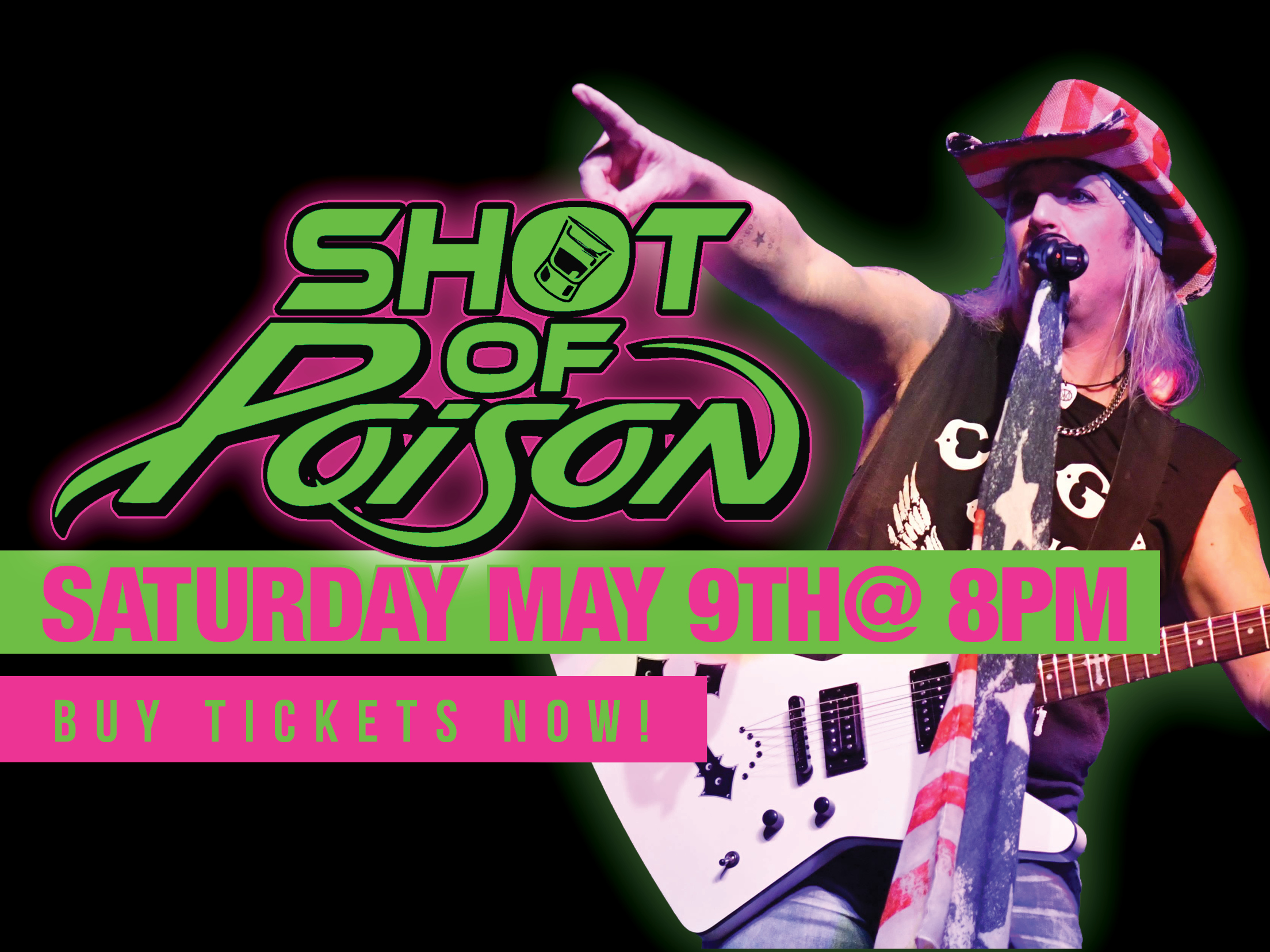 Shot of Poison is a group of talented, veteran musicians who, in 2017, created the most authentic tribute to Poison as they are today, the fun-loving, Los Angeles-based glam rockers who burst onto MTV in 1987 and created a phenomenon, sold 50 million records worldwide, and became legendary for their energetic live shows.