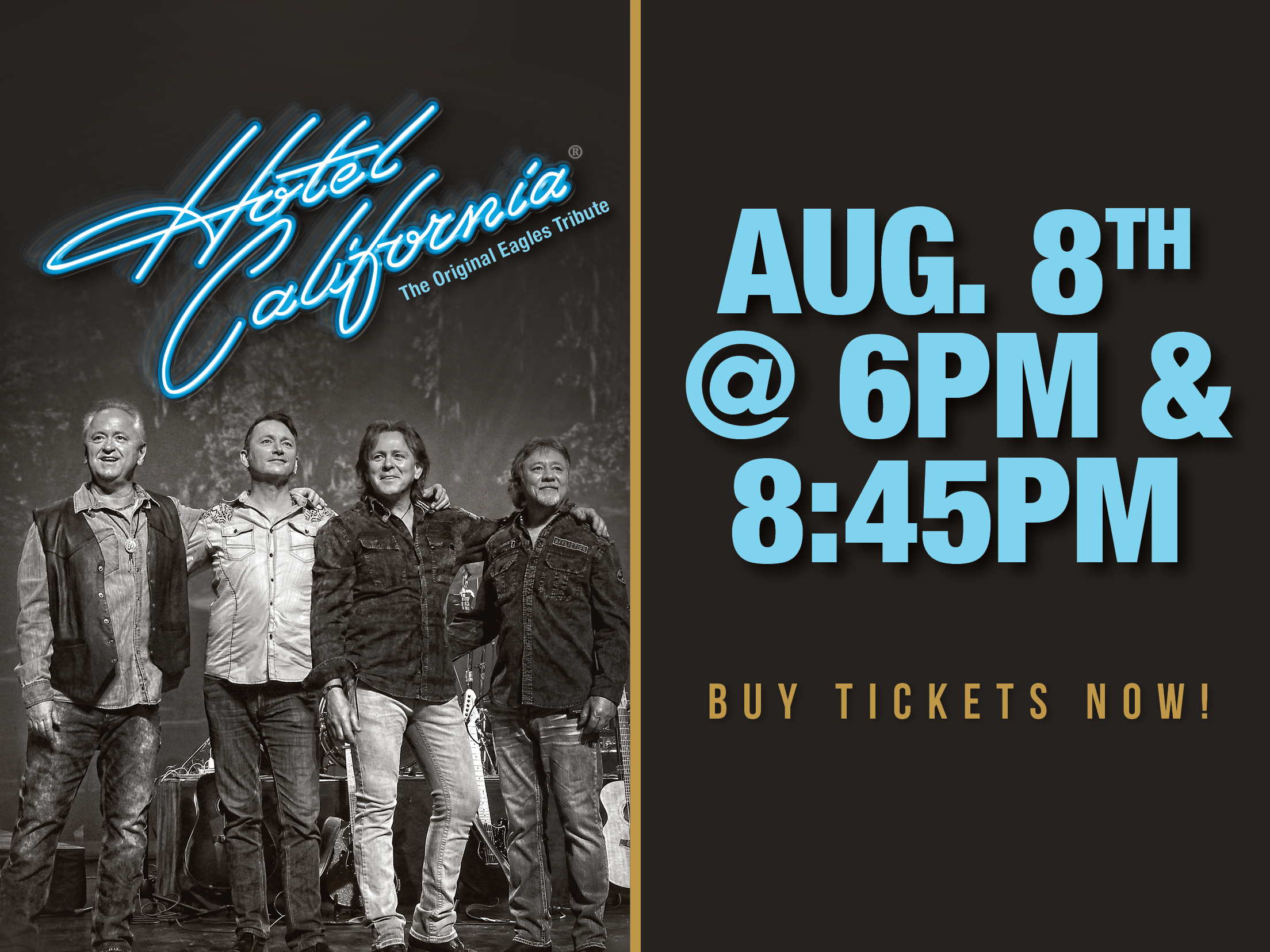 When The Eagles stopped to catch their breath a few decades ago, having sold over 100 million records, collected six Grammy's, and enjoyed six #1 albums, Hotel California began a pioneering journey through their history-making music that has taken them around the globe and thrilled hundreds of thousands of Eagles fans. It's been a journey they could never have imagined back in 1986, but their dedication, unique musical gifts, and an obsessive commitment to doing this legendary music true justice in performance, set them apart from the many Eagles bands that came after them. Hotel California toured relentlessly from the 80's straight through to today, setting the standard for world-class tribute productions as they went, and sharing stages with the likes of The Doobie Bros., Lynyrd Skynyrd, Gretchen Wilson, REO Speedwagon, and many more. From Japan to Dubai, Toronto to Texas, Hotel California has boldly taken the tribute band where none had gone before them, and changed an industry's collective mind about how good a "tribute" band could really be.